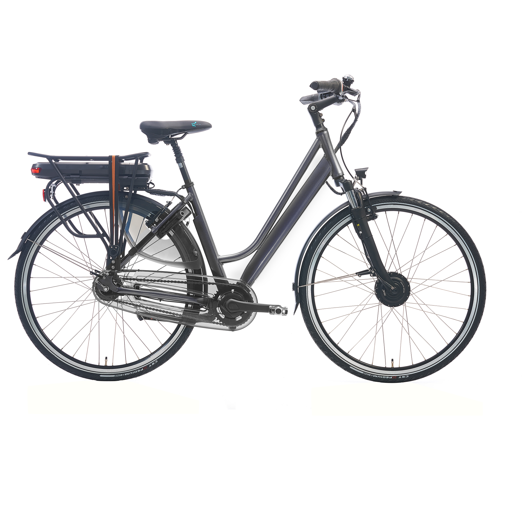 Köhlman Nexus 7 E-Bike D51cm. Shimano Nexus 7, Mxus voorwielmotor, 36V 13A 470 accu, , Zoom verende voorvork, verende zadelpen, Zwart dubbelwandige aluminium velgen, Hebie spatborden, Abus 4850LH slot, CST banden, Mxus motor. 5 ondersteuningsstanden, LED display. V-brake voor en achter, Grijs mat.